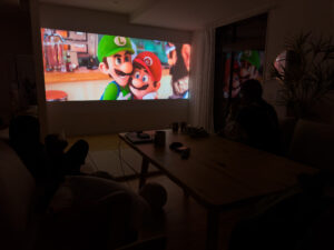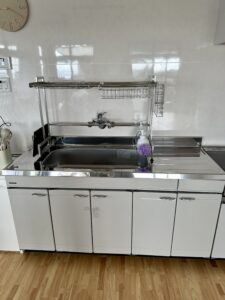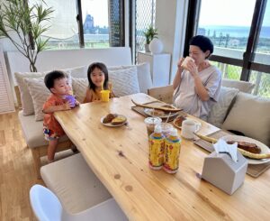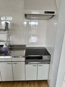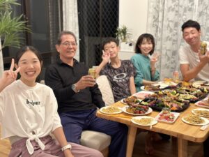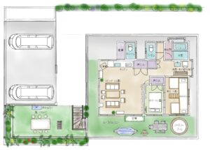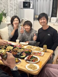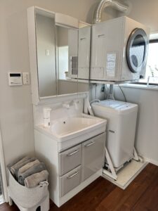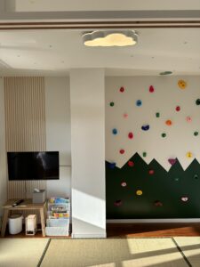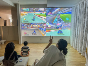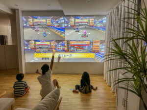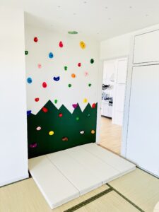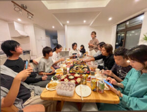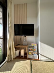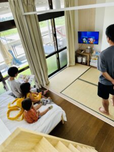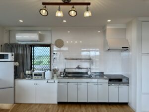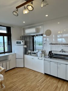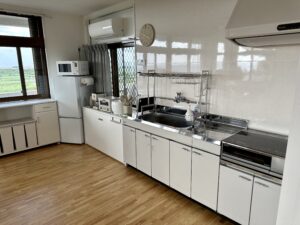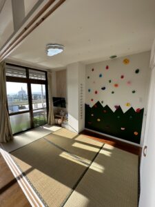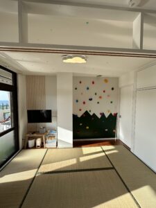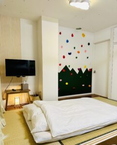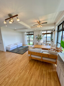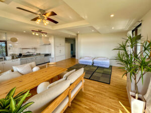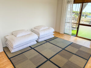 リビング【寝室③ 9人以上宿泊の際はリビングにお布団を敷いてご利用ください。写真の通りに敷いてちょうど10名様分になります。12名様の場合はテーブルをはじに寄せて、キッチン側にお布団を敷く形になります。】
