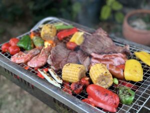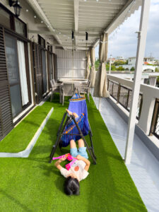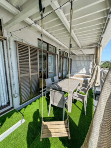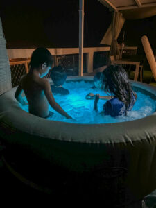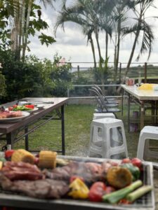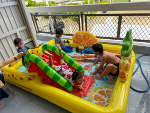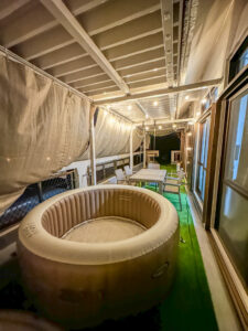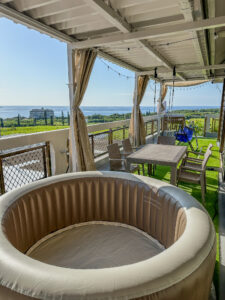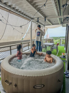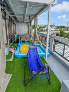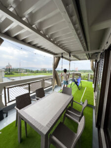 テラス【テラスではBBQは禁止ですが、ホットプレートはご利用可能です。テラス焼肉も好評ですよ。貸出しのビニールプールは滑り台付き。ジャグジーは防水ライトを投入してパリピ気分♪】